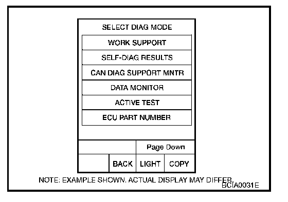6. Select diagnosis mode. "WORK SUPPORT", "SELF-DIAG RESULTS", "CAN DIAG SUPPORT MNTR", "DATA MONITOR", "ACTIVE TEST" and "ECU PART NUMBER" are available.