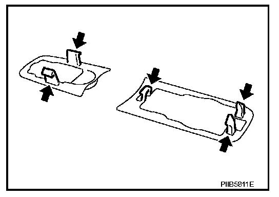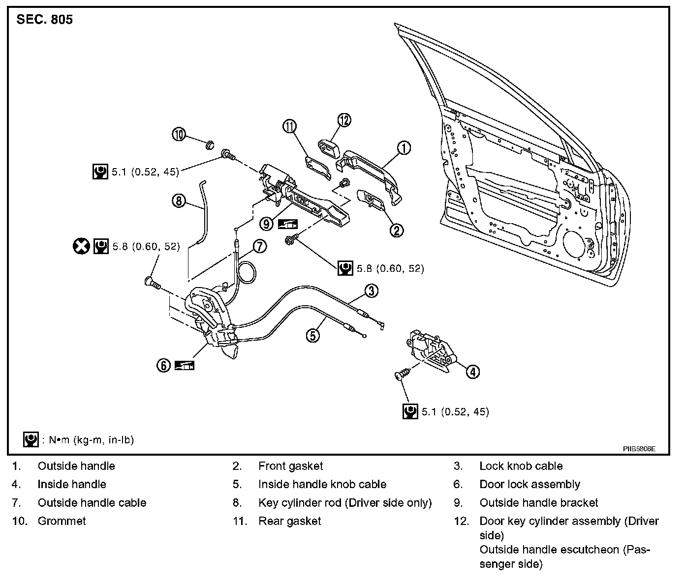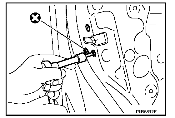 4. Remove door side grommet, and remove door key cylinder assembly (driver side) and outside handle escutcheon (passenger side) bolts (TORX T30) from grommet hole.