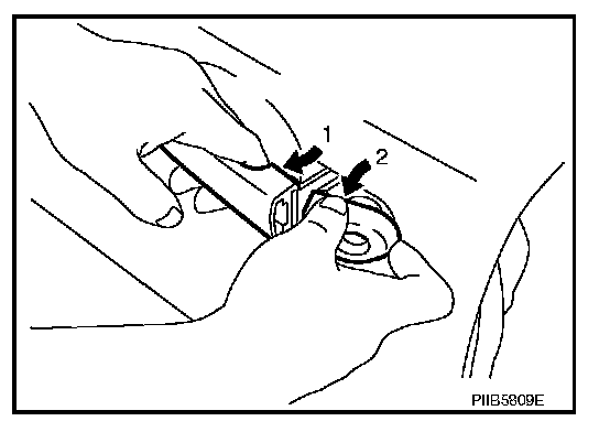 5. Disconnect door antenna and door request switch connector and remove harness clamp. (Models with intelligent Key system)