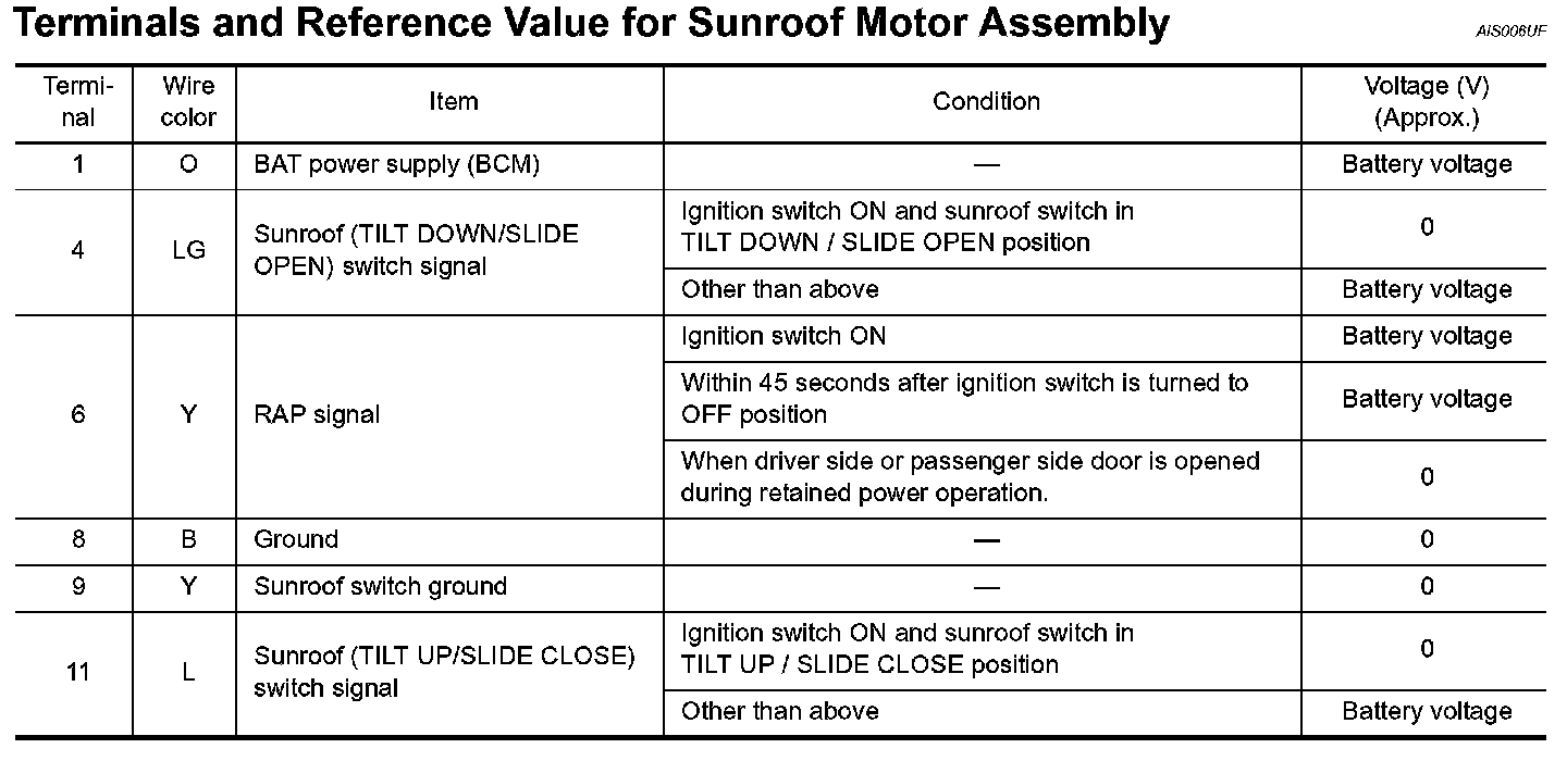 Terminals and Reference Value For Sunroof Motor Assembly