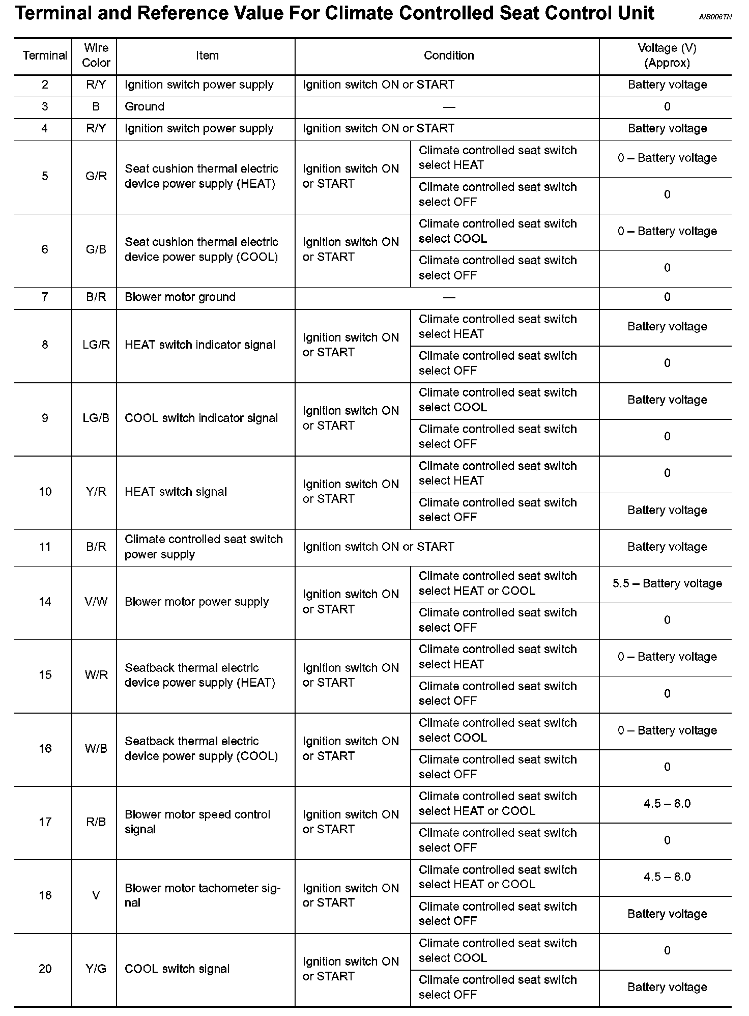 Terminals And Reference Values For Climate Controlled Seat Control Unit Part 1: