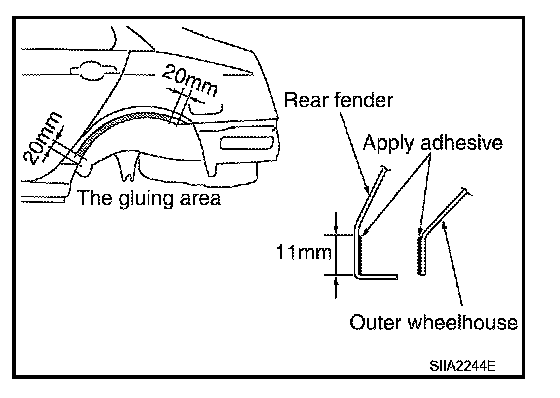 - Apply new adhesive to both specified areas of outer wheelhouse and rear fender.