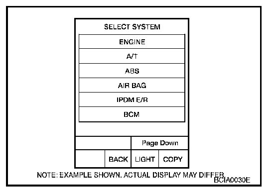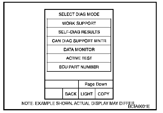 6. Touch any of "WORK SUPPORT", "SELF-DIAG RESULTS", "DATA MONITOR", "CAN DIAG SUPPORT MNTR", "ACTIVE TEST" and "ECU PART NUMBER" on selection screen.