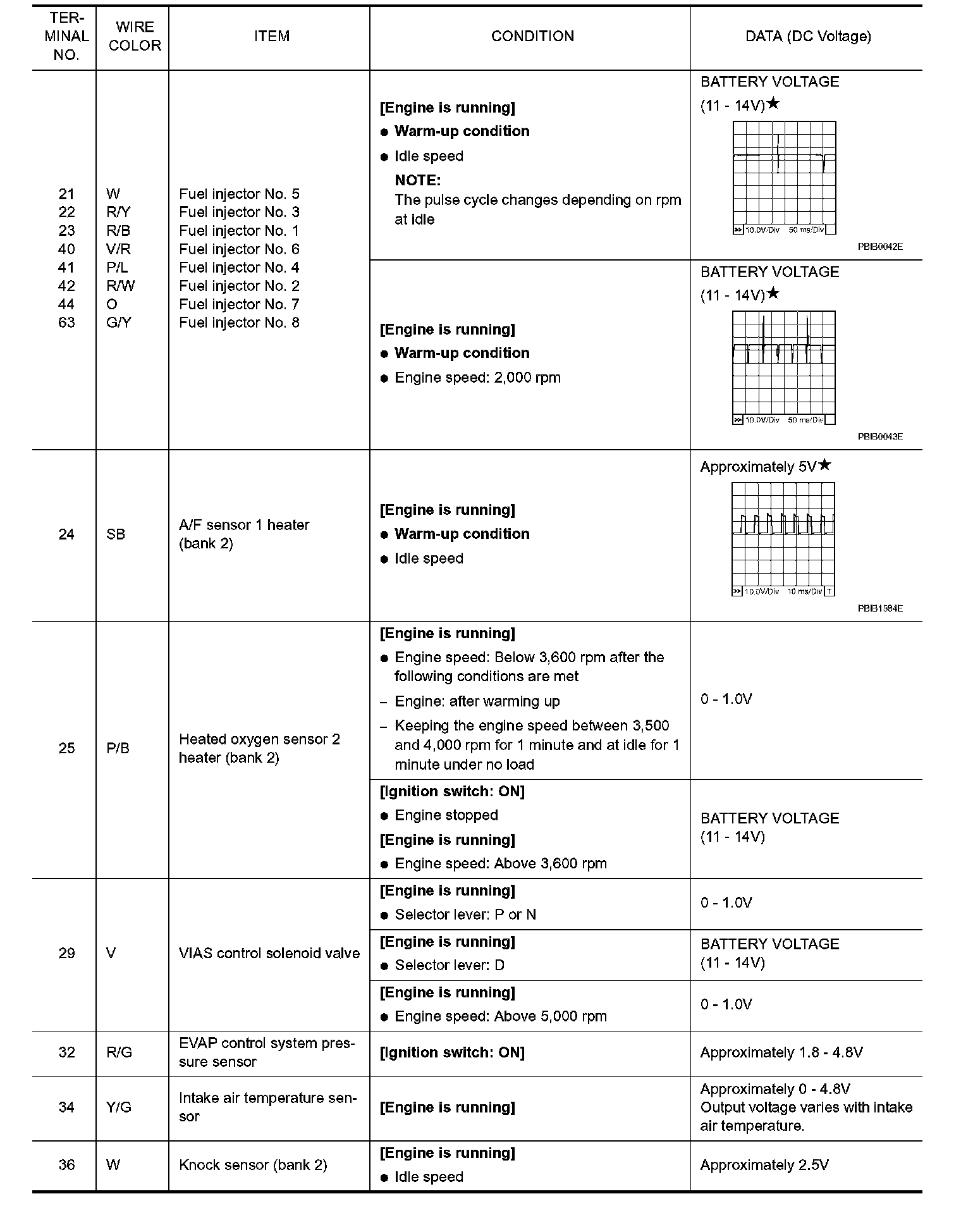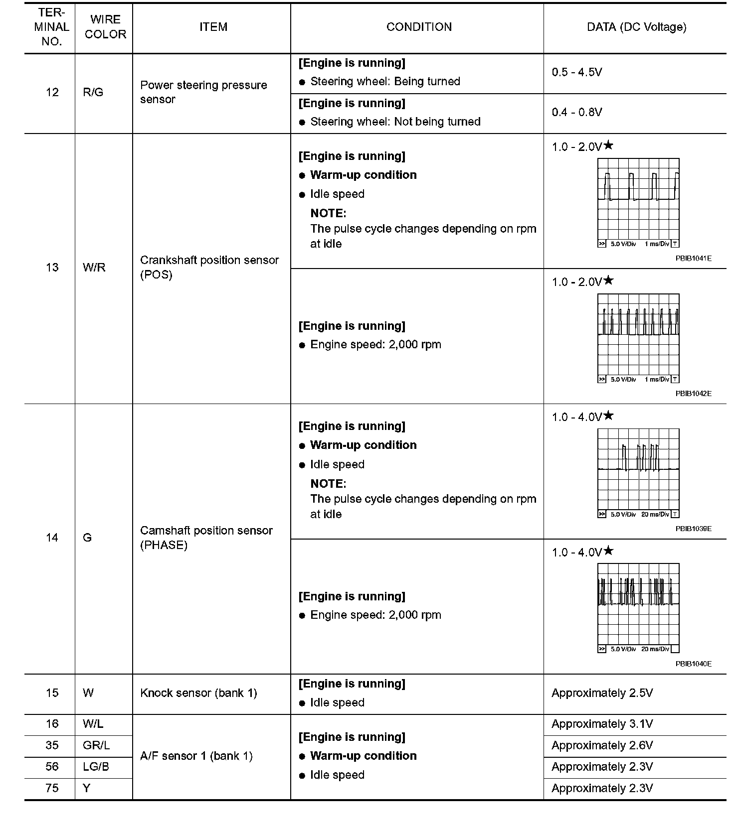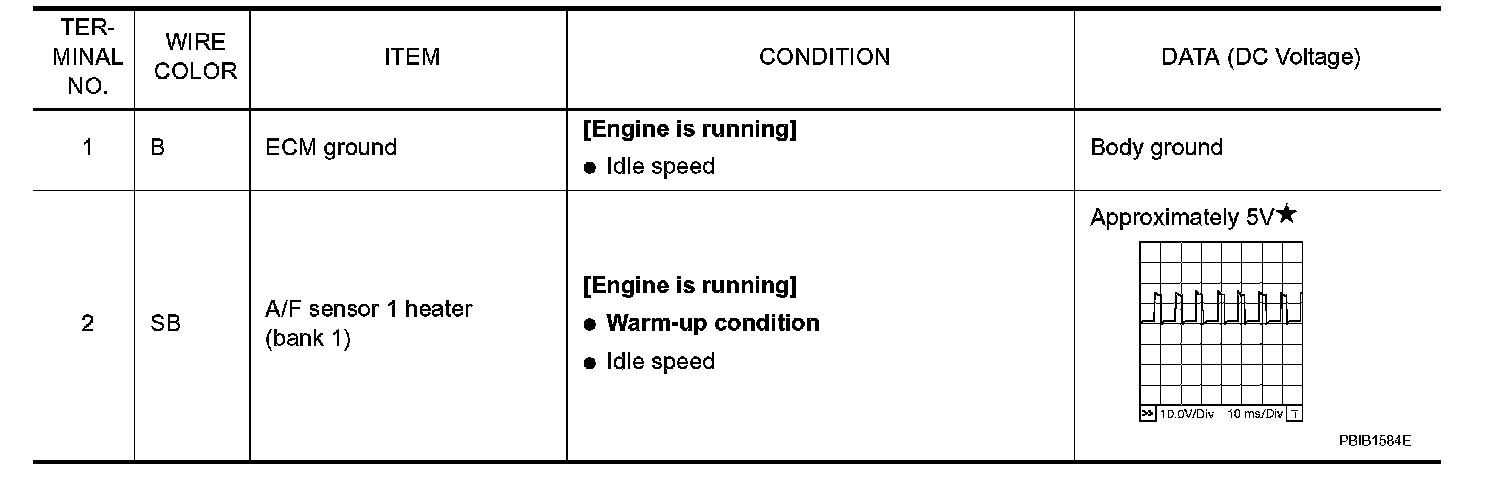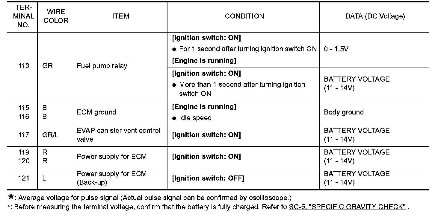 Specification data are reference values and are measured between each terminal and ground. Pulse signal is measured by CONSULT-II.
