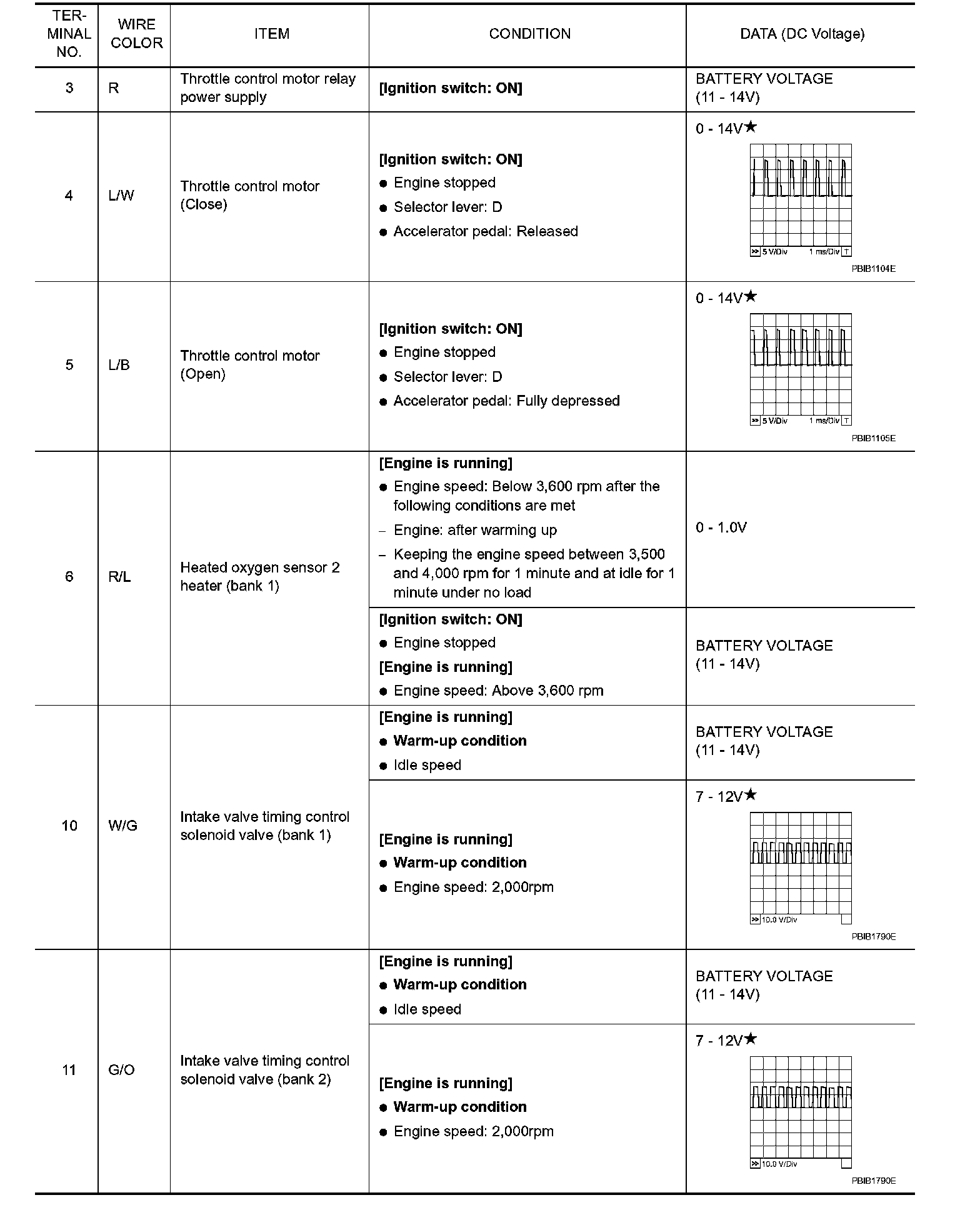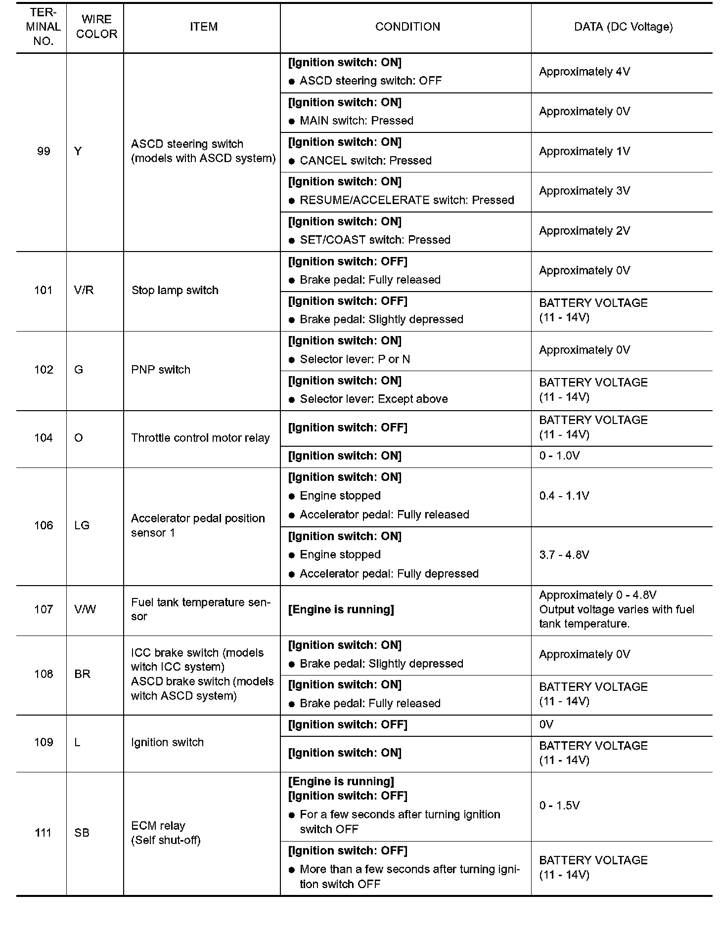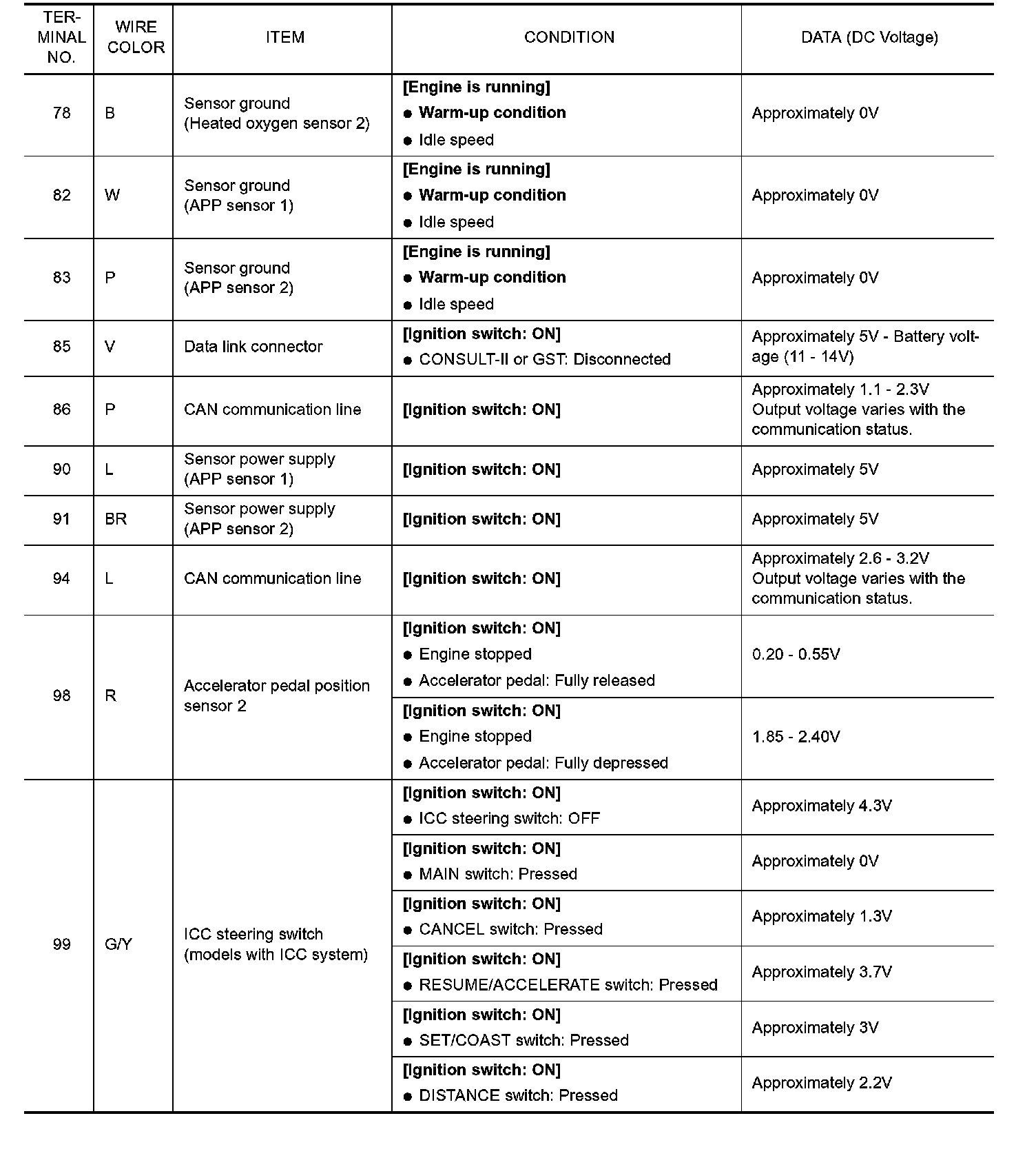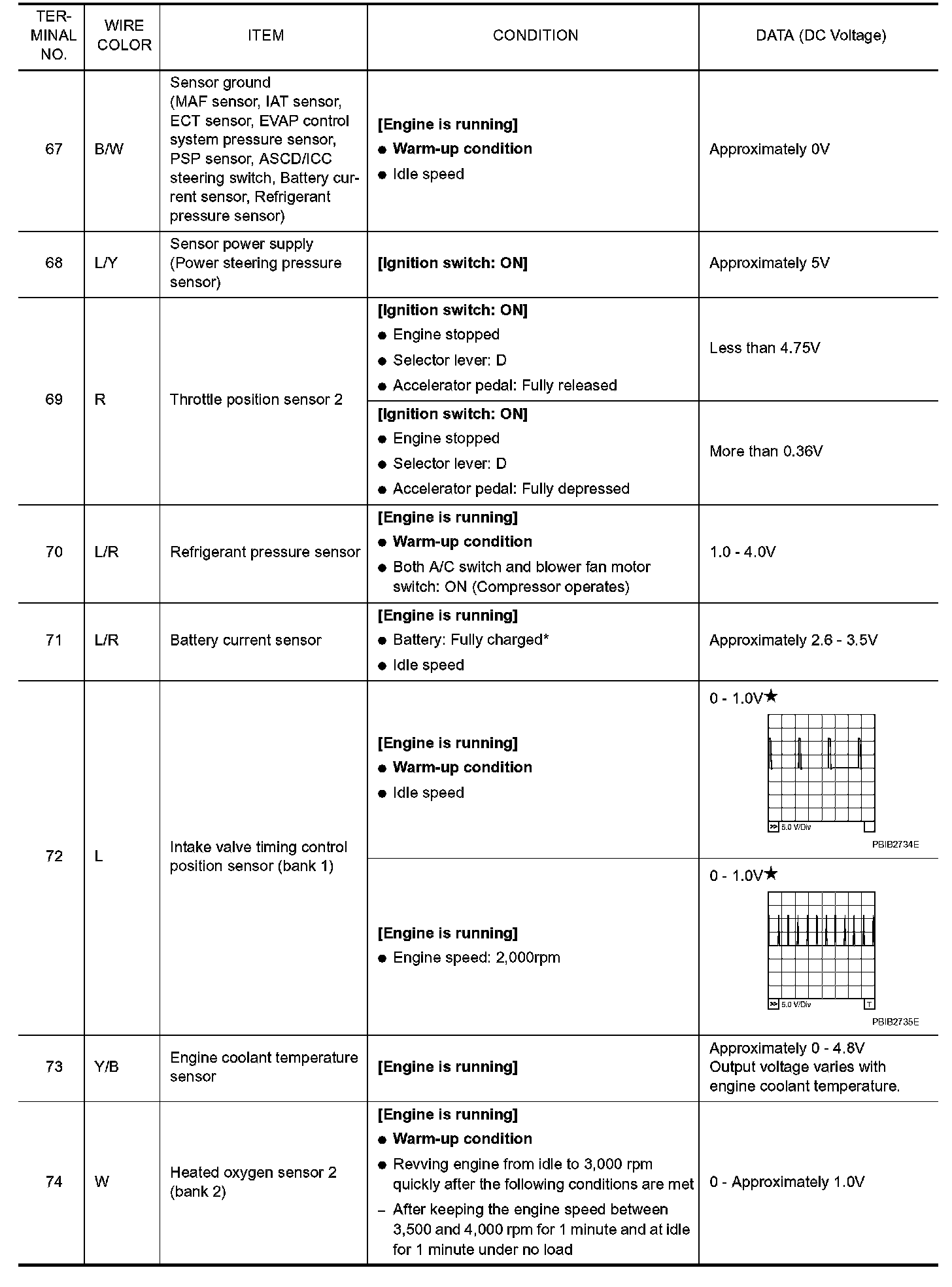 Specification data are reference values and are measured between each terminal and ground. Pulse signal is measured by CONSULT-II.