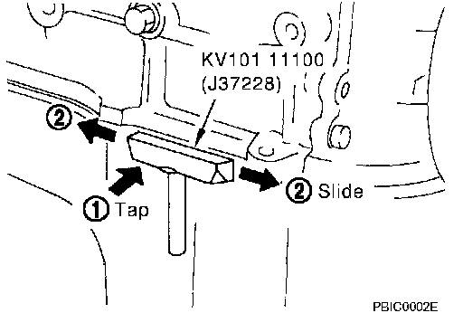 ^ After removing mounting nuts and bolts, separate the mating surface using the seal cutter [SST] and remove old liquid gasket sealing.