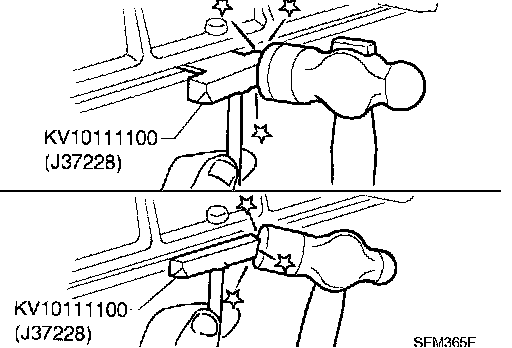 d. Insert seal cutter (SST) between oil pan and cylinder block. Slide seal cutter by tapping on the side of seal cutter with hammer. Remove oil pan.