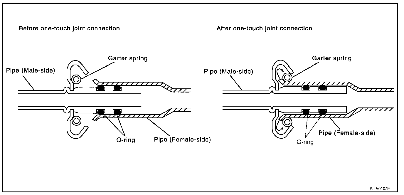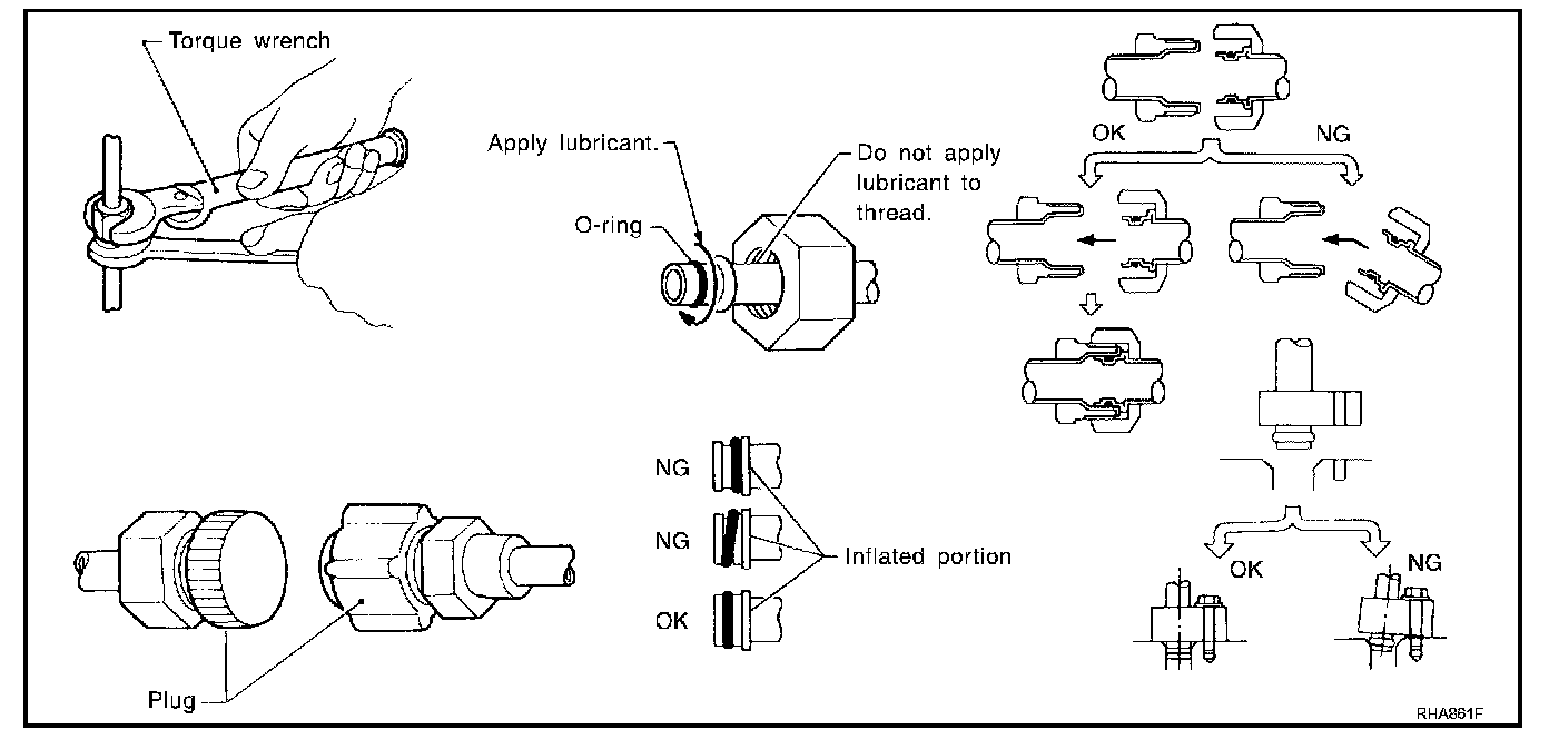 - After connecting line, perform leak test and make sure that there is no leakage from connections. When the refrigerant leaking point is found, disconnect that line and replace the O-ring. Then tighten connections of seal seat to the specified torque.