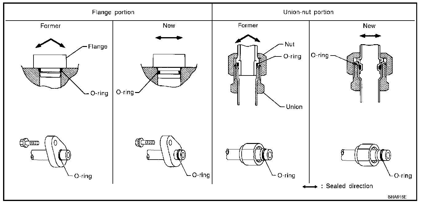 - The O-ring has been relocated. It has also been provided with a groove for proper installation. This eliminates the chance of the O-ring being caught in, or damaged by, the mating part. The sealing direction of the O-ring is now set vertically in relation to the contacting surface of the mating part to improve sealing characteristics.