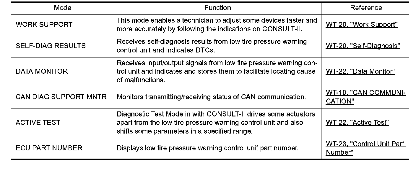 CONSULT-II can display each diagnosis item using the diagnosis test modes shown following.