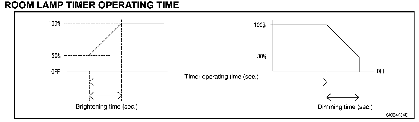 BCM controls applicable lamps to illuminate for 15 seconds (can be set maximum 30 seconds) by timer operation under following conditions. BCM also controls applicable lamps to brighten for 1 second (can be set maximum 5 seconds) when turned ON, or to dim for 3 seconds (can be set maximum 5 seconds) when turned OFF. (Timer operating time and dimming/brightening time can be changed with CONSULT-II. Refer to "WORK SUPPORT (INT LAMP)".) This control operates as follows.
