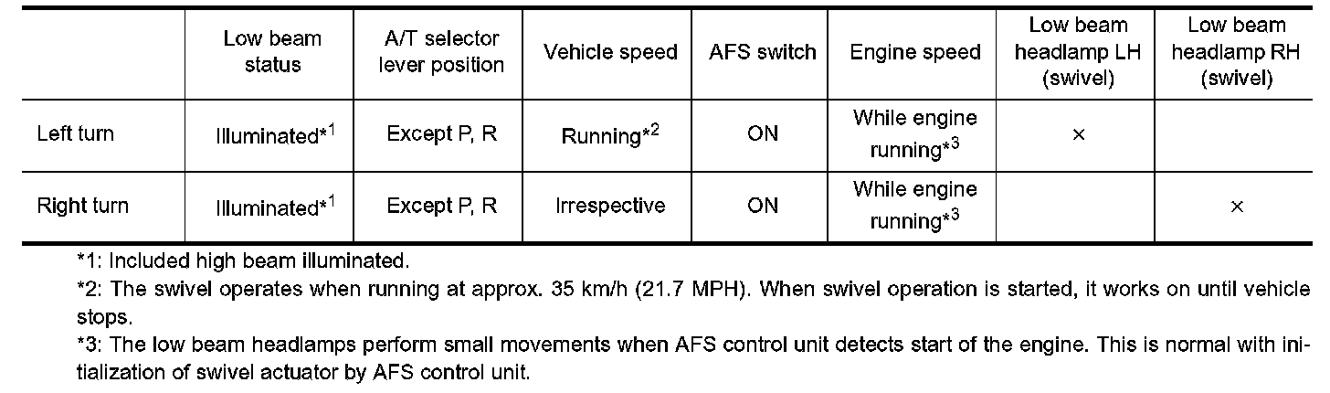 AFS control unit determines the current vehicle conditions by each received signals, and sends commands to the low beam headlamp to swivel. With the headlamps (HIGH/LOW) illuminated, the AFS switch on, engine running and the A/T select lever in any position but range P or range R, the low beam headlamps are operative by AFS control unit commands.