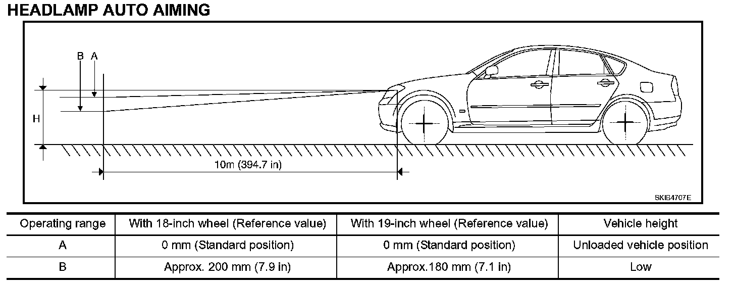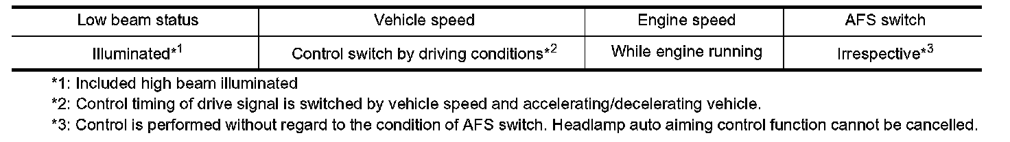 AFS control unit determines the current vehicle conditions by each received signals, and sends commands to the low beam headlamps to auto aiming. With the headlamps (HIGH/LOW) illuminated and engine running, the low beam headlamps are operative by AFS control unit commands.