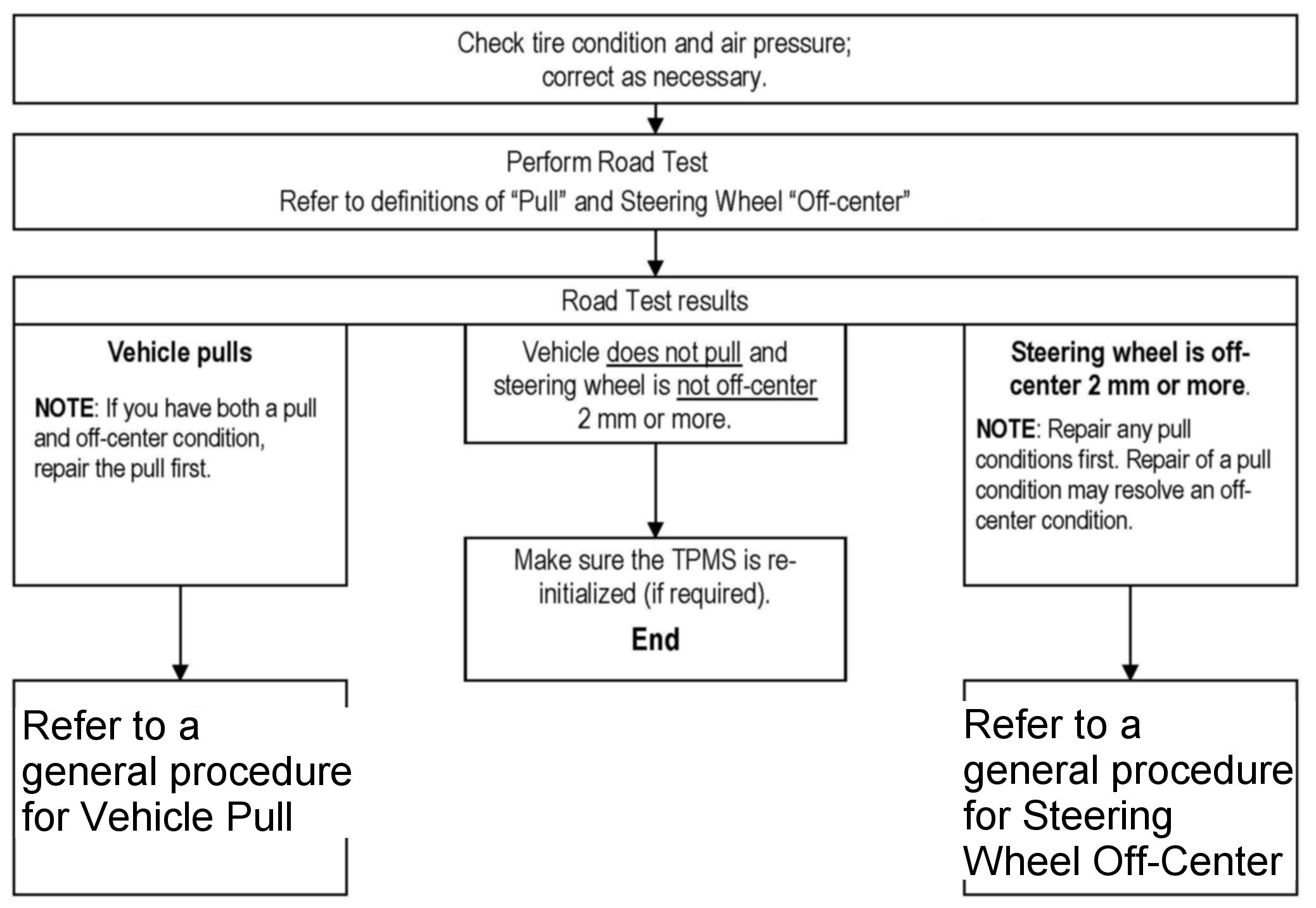 If a customers reports their "vehicle pulls" or the "steering wheel" is off-center use the Diagnostic Flow Chart above and the other information in this bulletin to diagnose and correct the issue.
