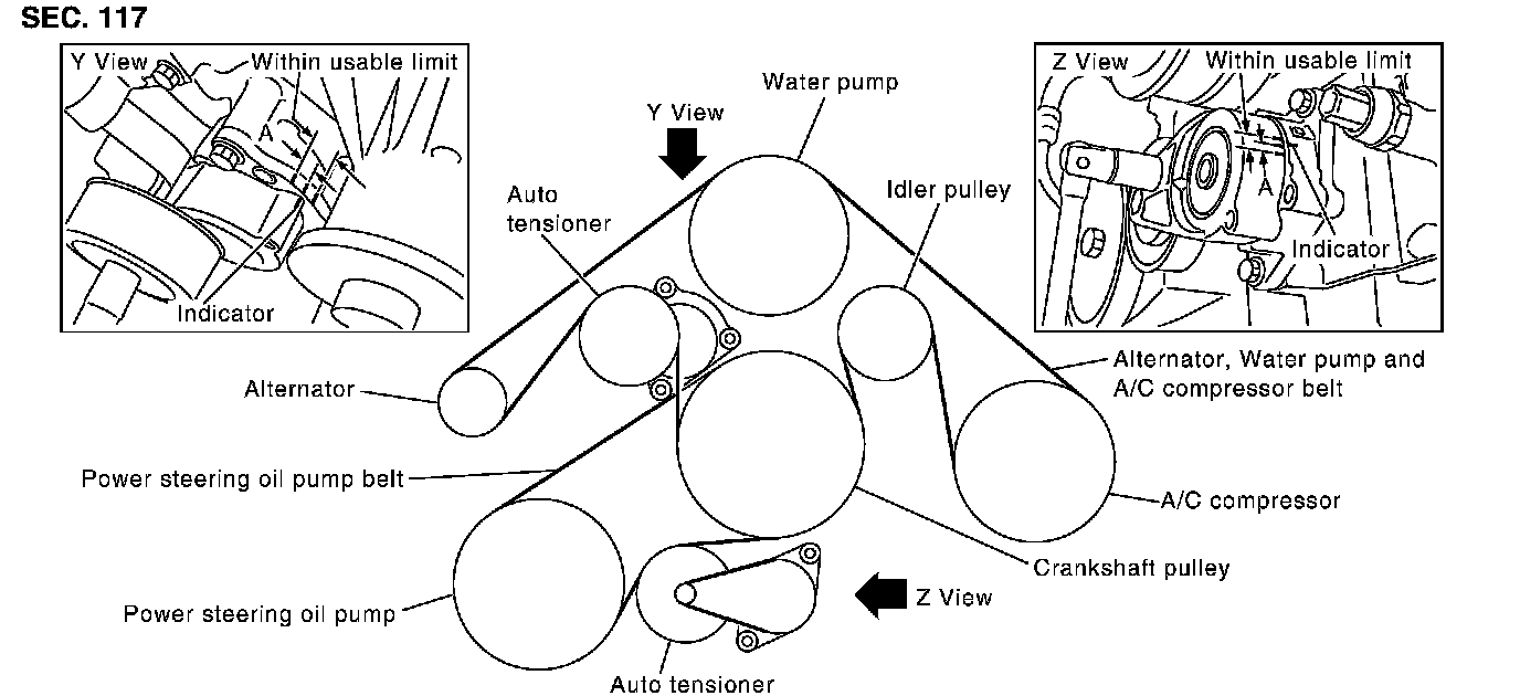 ^ Make sure that belt tension is within the allowable working range, using indicator notch on auto tensioner.