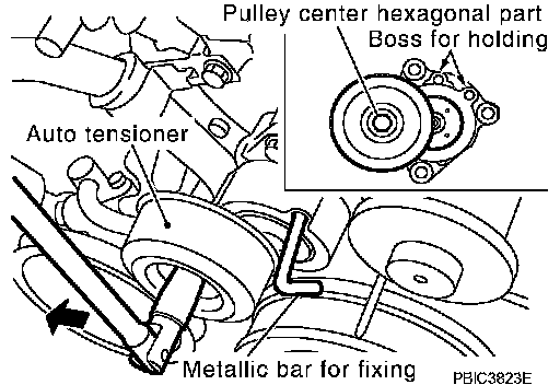 3. Under the above condition, insert a metallic bar of approximately 6 mm (0.24 inch) in diameter (hexagonal bar wrench shown as example in the figure) through the holding boss to lock auto tensioner pulley arm.