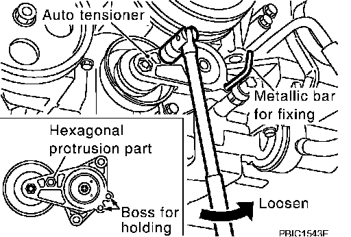 2. With box wrench, and while securely holding the hexagonal part in pulley center of auto tensioner, move wrench handle in the direction of arrow (loosening direction of tensioner).