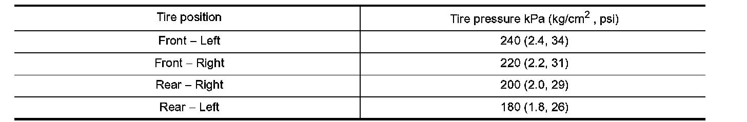 7. Adjust the tire pressure to the values shown in the table for ID registration, and drive the vehicle at 40 km/h (25 MPH) or more for a few minutes.