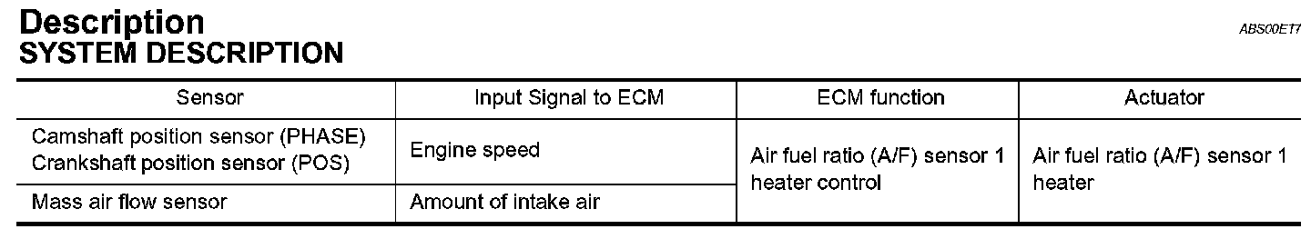 The ECM performs ON/OFF duty control of the A/F sensor 1 heater corresponding to the engine operating condition to keep the temperature of A/F sensor 1 element at the specified range.