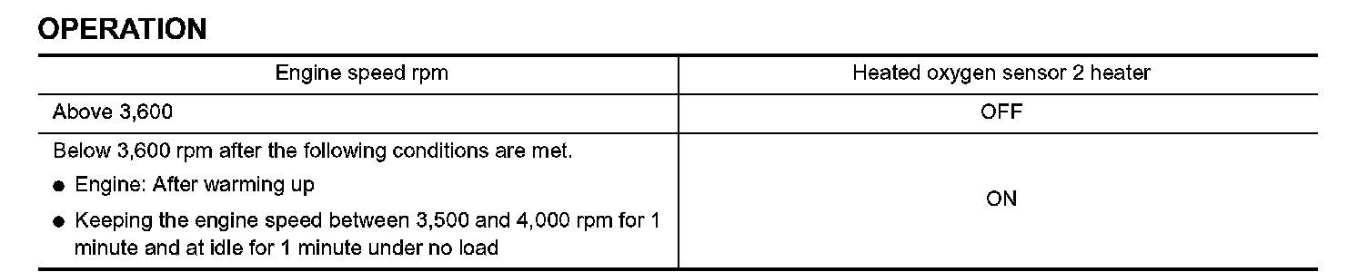 The ECM performs ON/OFF control of the heated oxygen sensor 2 heater corresponding to the engine speed, amount of intake air and engine coolant temperature.