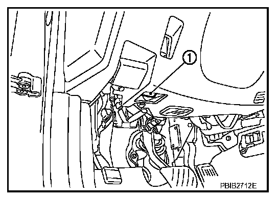 2. Connect CONSULT-II and CONSULT-II CONVERTER to data link connector (1), which is located under LH dash panel near the hood opener handle.