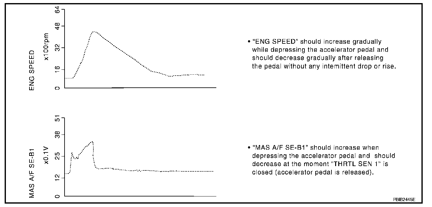 The signal of "ACCEL SEN 1" and "THRTL SEN 1" should rise gradually without any intermittent drop or rise after "CLSD THL POS" is changed from "ON" to "OFF".