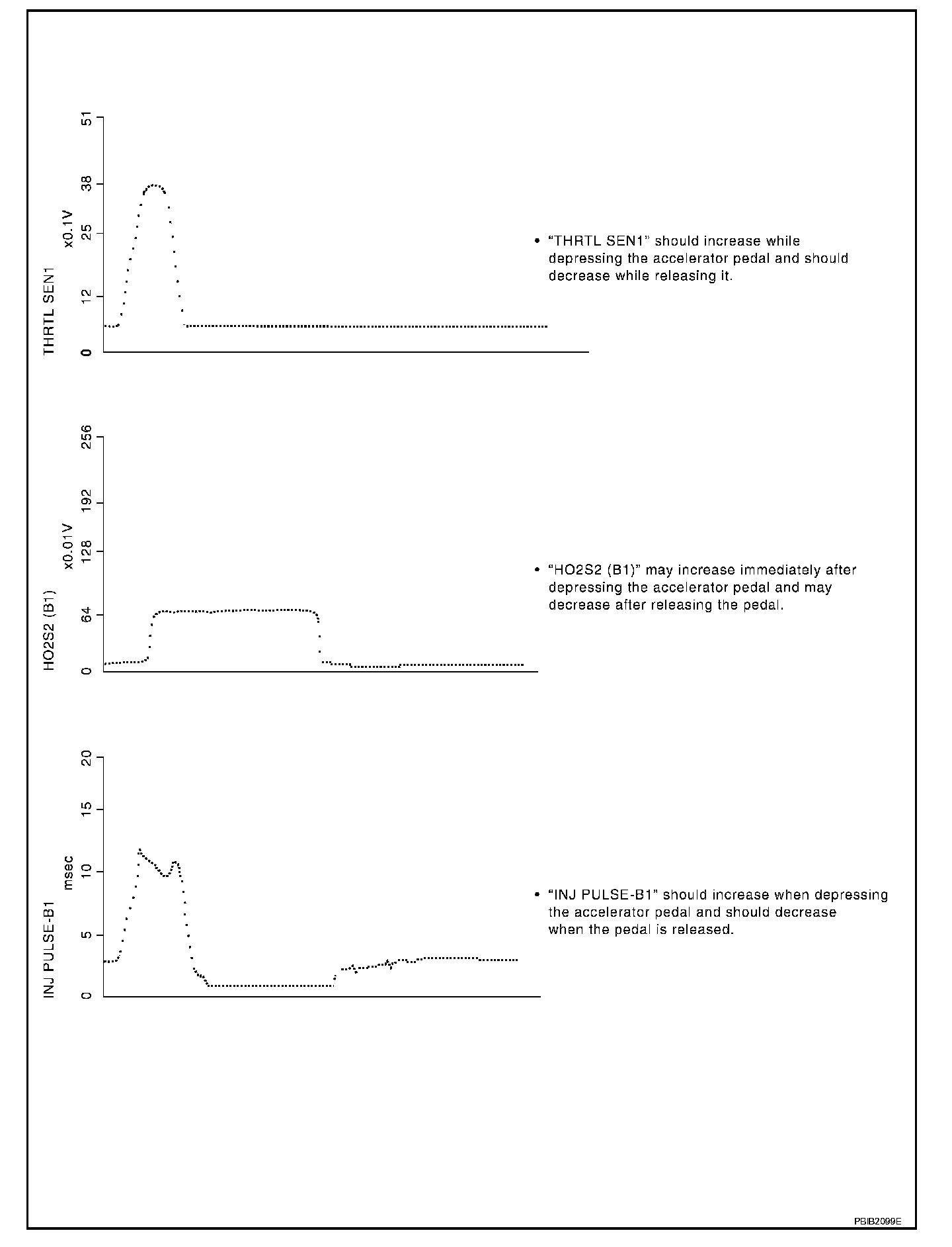 Below is the data for "ENG SPEED", "MAS A/F SE-B1", "THRTL SEN 1", "HO2S2 (B1)" and "INJ PULSE-B1" when revving engine quickly up to 4,800 rpm under no load after warming up engine sufficiently. Each value is for reference, the exact value may vary.