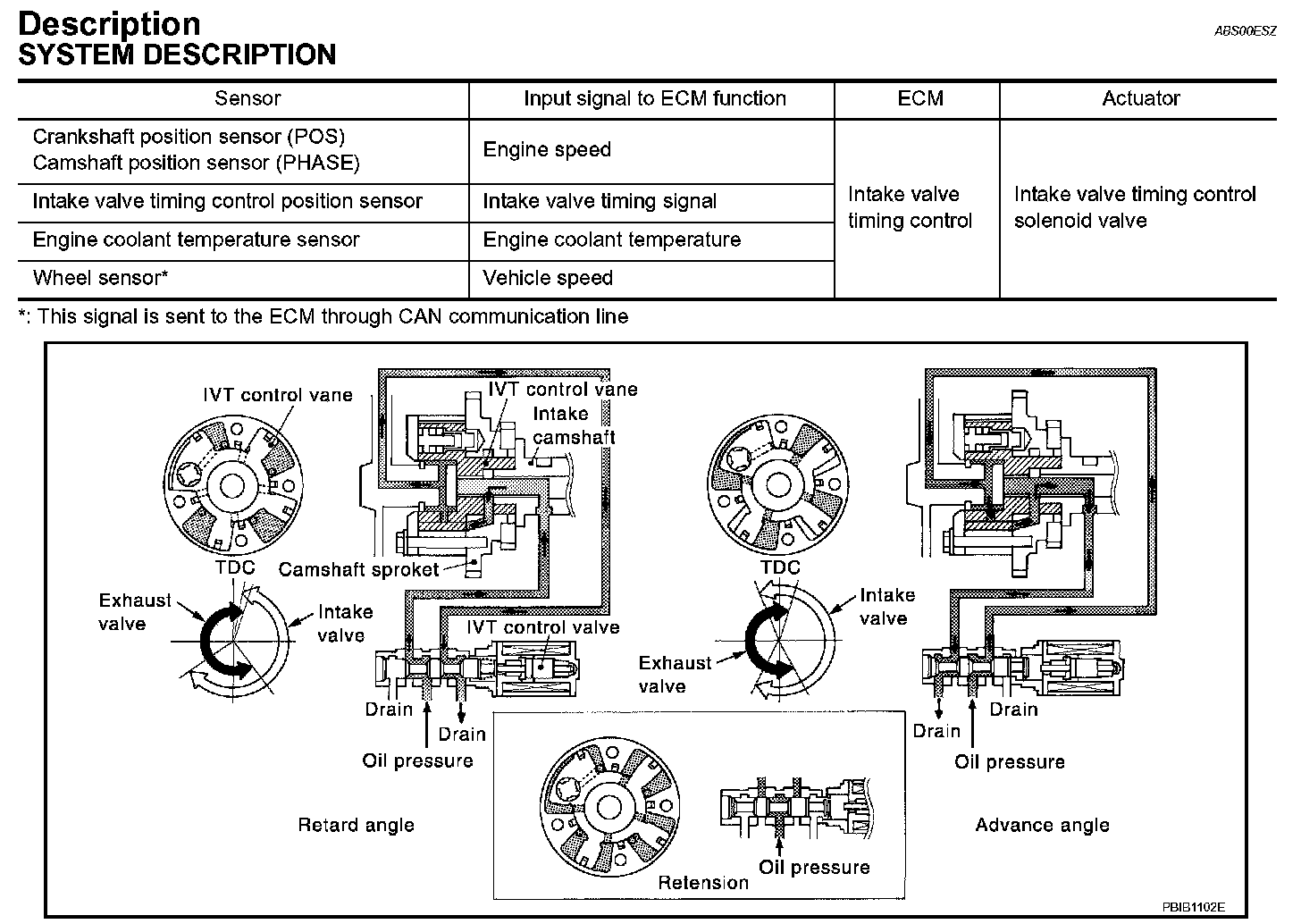 The ECM receives signals such as crankshaft position, camshaft position, engine speed, and engine coolant temperature. Then, the ECM sends ON/OFF pulse duty signals to the intake valve timing (IVT) control solenoid valve depending on driving status. This makes it possible to control the shut/open timing of the intake valve to increase engine torque in low/mid speed range and output in high-speed range.
