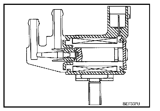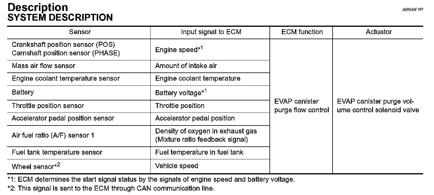 This system controls flow rate of fuel vapor from the EVAP canister. The opening of the vapor by-pass passage in the EVAP canister purge volume control solenoid valve changes to control the flow rate. The EVAP canister purge volume control solenoid valve repeats ON/OFF operation according to the signal sent from the ECM. The opening of the valve varies for optimum engine control. The optimum value stored in the ECM is determined by considering various engine conditions. When the engine is operating, the flow rate of fuel vapor from the EVAP canister is regulated as the air flow changes.
