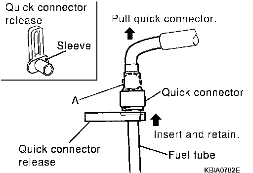 d. Pull quick connector by hand holding A position. Make sure it is completely engaged (connected) so that it does not come out from fuel tube.