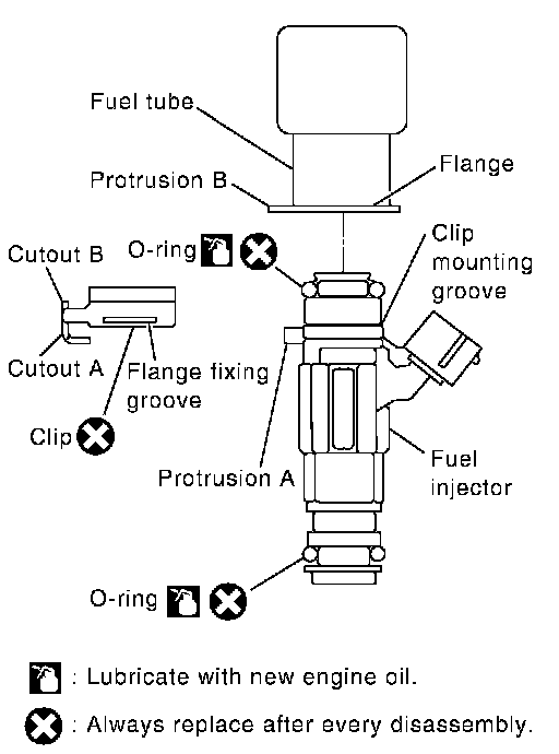 ^ Insert fuel injector so that protrusion B of fuel tube matches cutout B of clip.