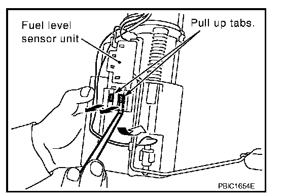 3. After fixing tabs are disengaged, slide fuel level sensor unit out in direction shown by the arrow.