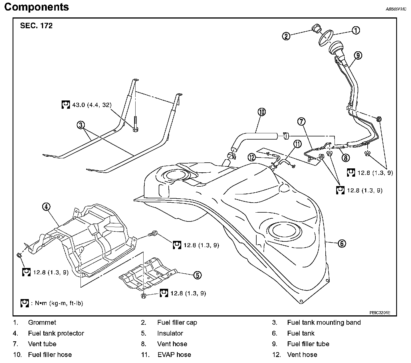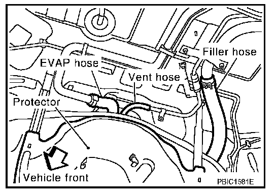 7. Disconnect fuel filler hose, vent hose and EVAP hoses at fuel tank side.