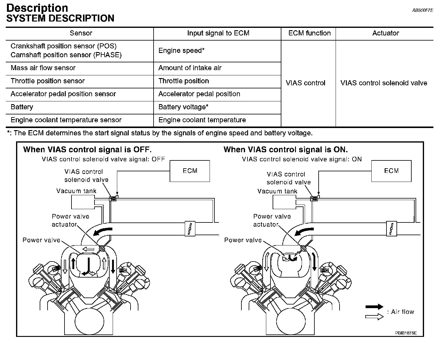 The surge tank and one-way valve are provided. When engine is running at high speed, the ECM sends the signal to the VIAS control solenoid valve. This signal introduces the intake manifold vacuum into the power valve actuator and therefore opens the power valve to two suction passages together in the collector. Under this condition, the effective port length is equivalent to the length of the suction port provided independently for each cylinder. This shortened port length results in enhanced engine output with reduced suction resistance under high speeds.