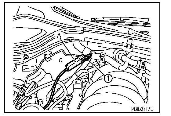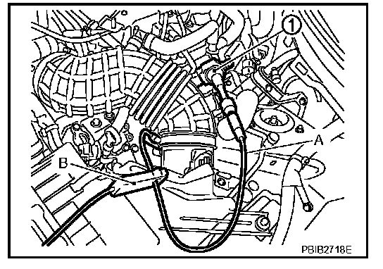 2. Connect ignition coil No. 1 (1) and spark plug No. 1 with suitable high-tension wire A as shown, and attach timing light clamp B to this wire.