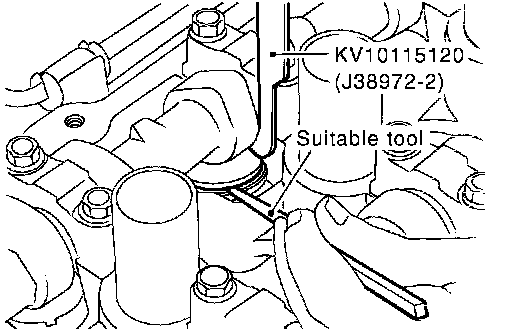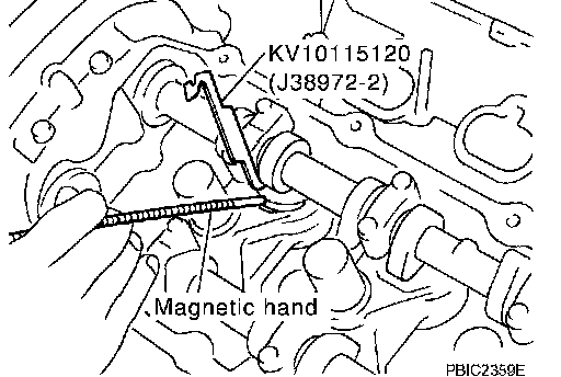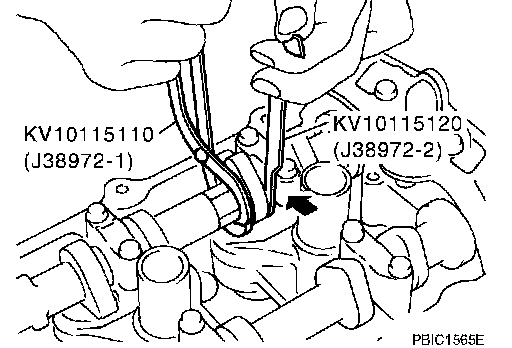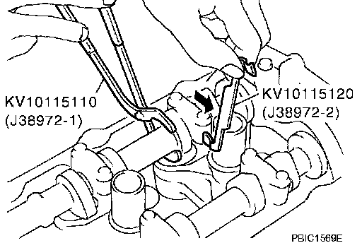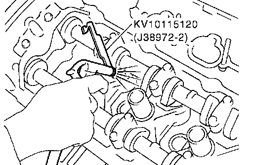 NOTE: Exhaust side of No. 7 and 8 cylinder does not have space for installing camshaft pliers [SST: KV10115110 (J38972-1)]. therefore, install lifter stopper [SST: KV10115120 (J38972-2)] according to the following instructions.