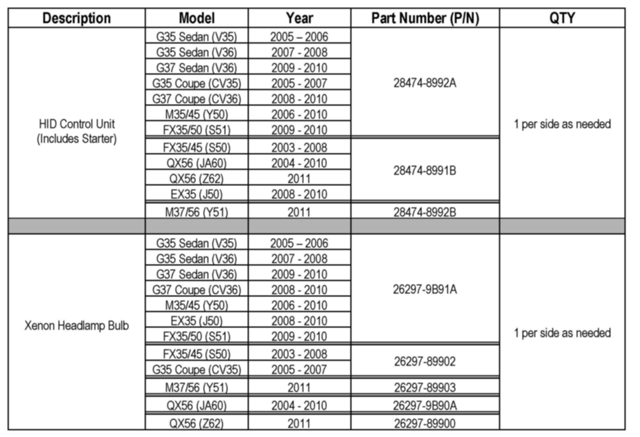 APPLIED VEHICLES: 2005 - 2011 Infiniti with xenon headlamps