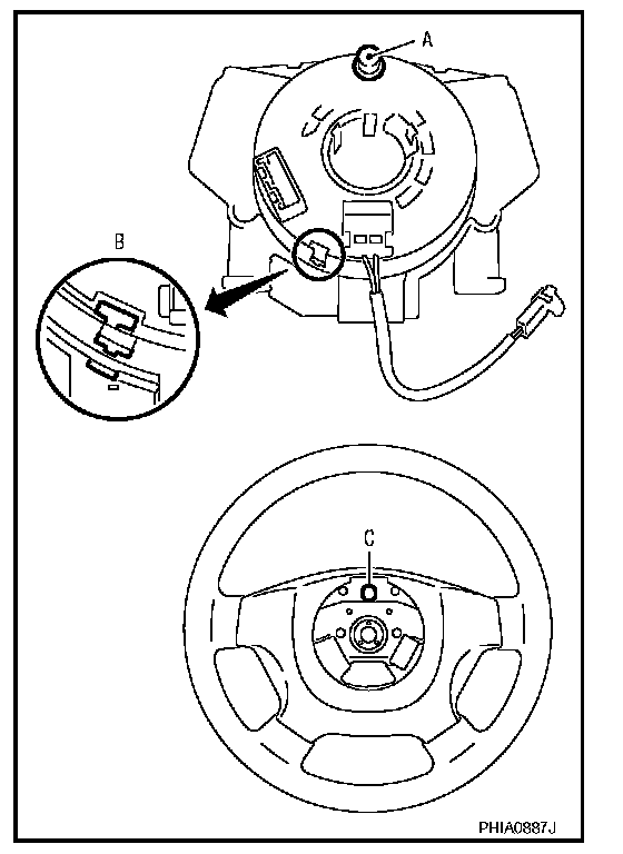 - Adjust the spiral cable locating pin (showed as A in the figure) to the steering wheel locating pin hole (showed as C in the figure).