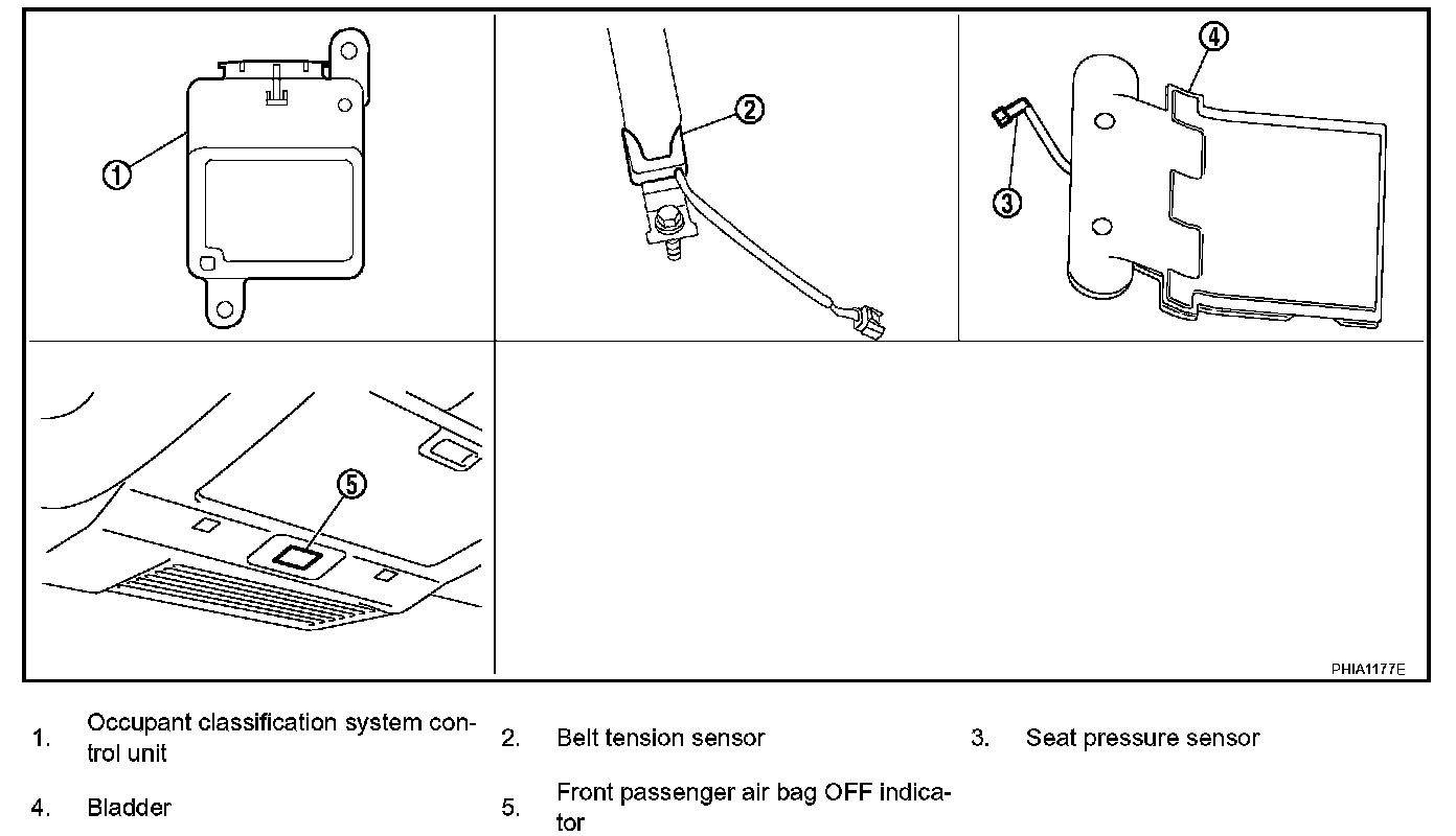 The occupant classification system identifies different size occupants, by detecting if child seat is present in the front passenger seat. The occupant classification system receives inputs from the occupant classification sensor (located inside the passenger seat cushion assembly) and belt tension sensor (part of the passenger front seat belt assembly and located at the belt anchor location). Depending on classification of passenger, the occupant classification system sends a signal to the diagnosis sensor unit. The diagnosis sensor unit uses this signal to determine either full or non deployment of passenger front air bag in the event of a collision. Depending on the signal received, the diagnosis sensor unit can disable the passenger front air bag completely. If this occurs the diagnosis sensor unit will turn on the PASS AIR BAG OFF indicator.