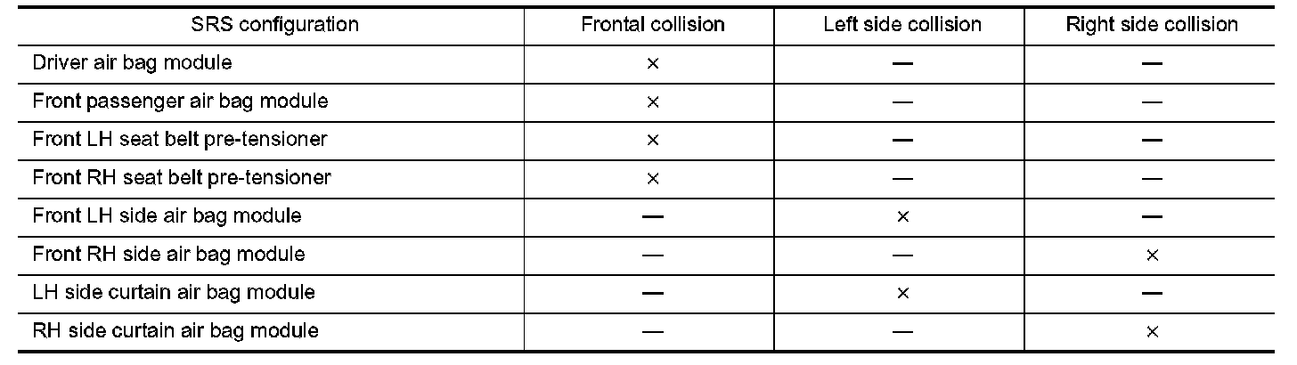 The collision modes for which supplemental restraint systems are activated are different among the SRS systems. For example, the driver air bag module and front passenger air bag module are activated in a frontal collision but not in a side collision.