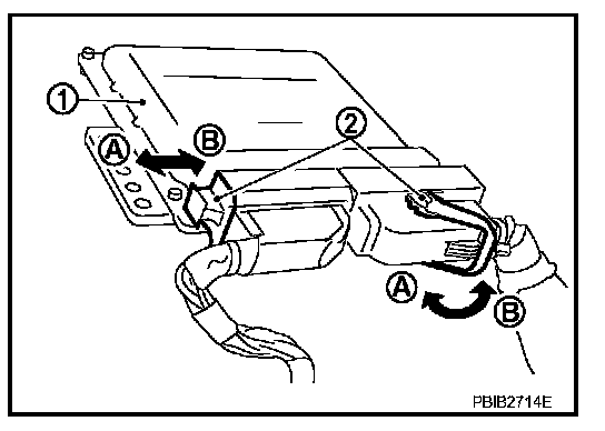 - When connecting ECM harness connector, fasten (B) it securely with a lever (2) as far as it will go as shown in the figure.