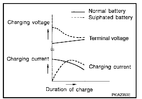 To determine if a battery has been "sulphated", note its voltage and current when charging it. As shown in the figure, less current and higher voltage are observed in the initial stage of charging sulphated batteries.
