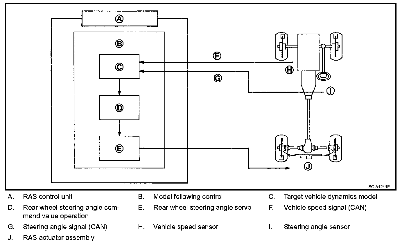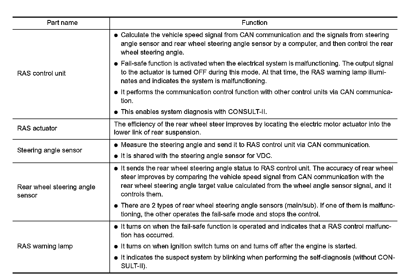 In the event there is a malfunction with the electrical system, the RAS control is stopped and the fail-safe mode is activated. At that time, it indicates the malfunction by turning the RAS warning lamp ON and stops the rear wheel control.