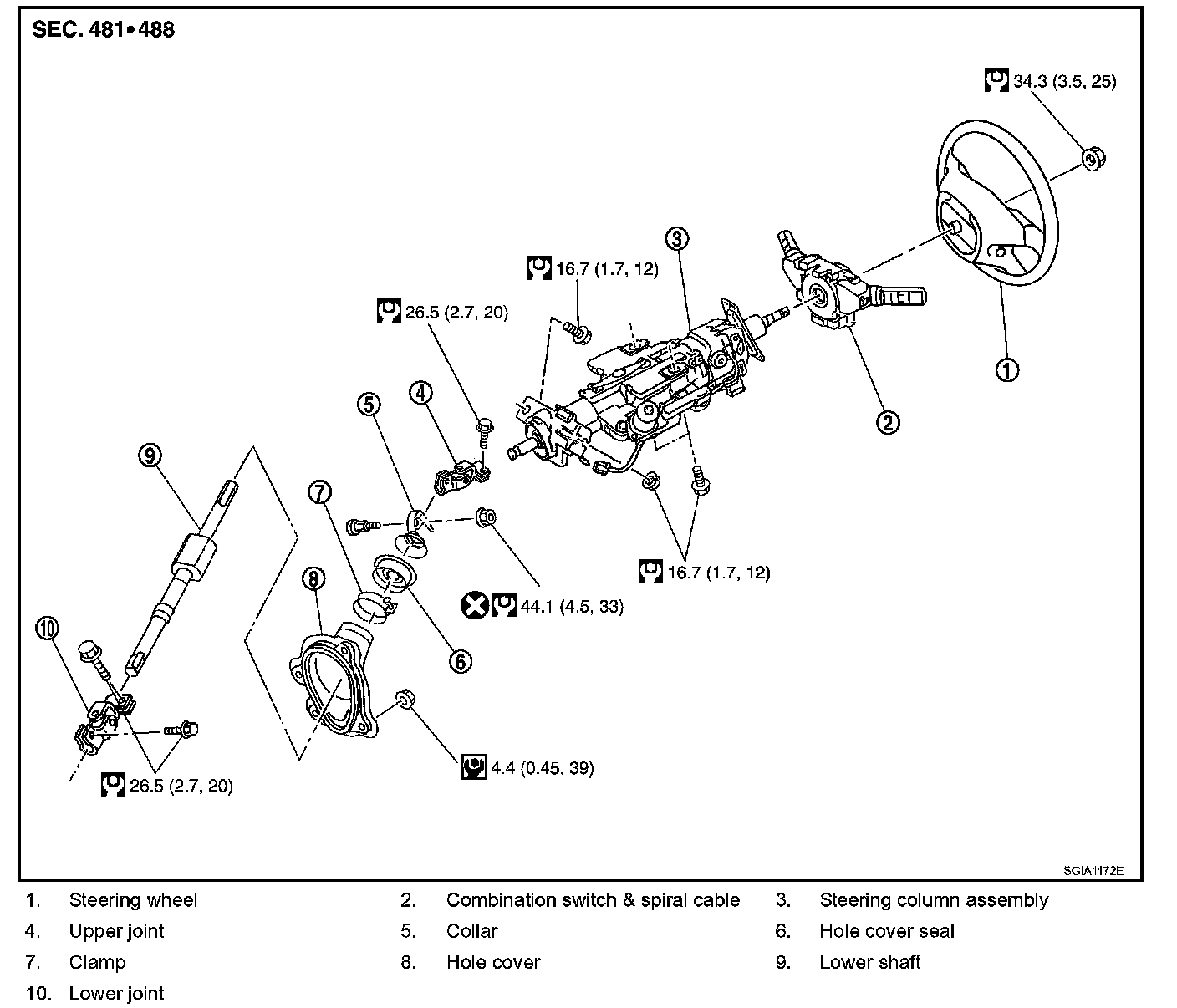 ^ Check each part of steering column assembly for damage or other malfunctions. Replace if there are.