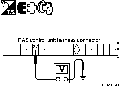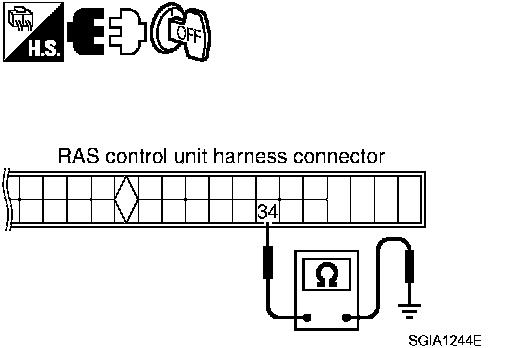Turn ignition switch OFF, disconnect RAS control unit harness connector, and check terminal for deformation, disconnection, looseness, etc.