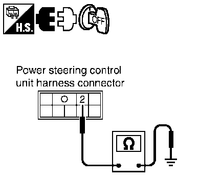 Disconnect power steering control unit harness connector M8, and then check continuity between power steering control unit harness connector M8 and ground.