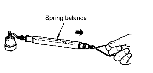 ^ Hook a spring balance at cutout on ball stud. Confirm spring balance measurement value is within specifications when ball stud begins moving.