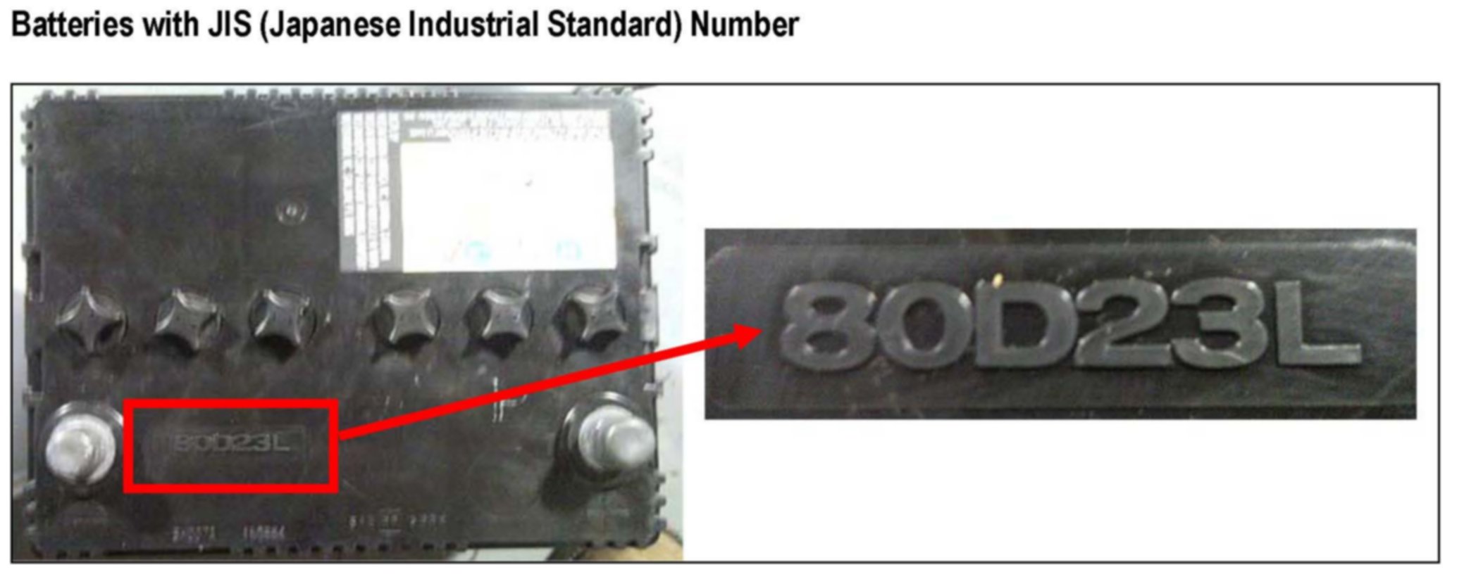 ^ Batteries installed in vehicles produced in Japan have a JIS number embossed in the plastic on top of the battery.