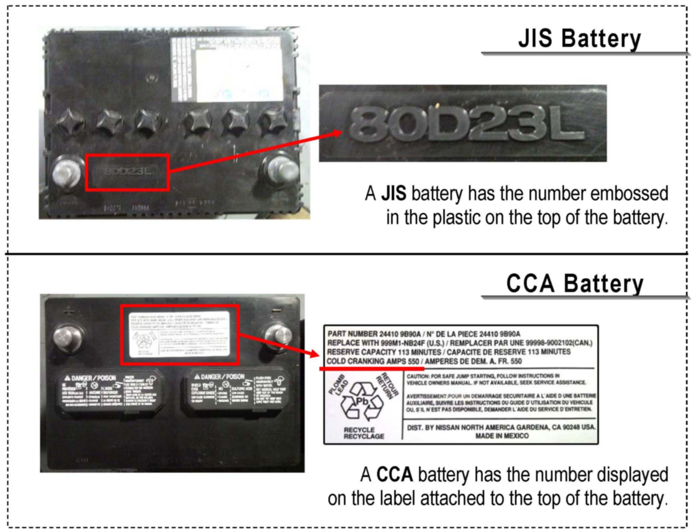 Infiniti vehicles equipped with standard lead/acid batteries use one of two different types with unique battery rating specifications: JIS & CCA.