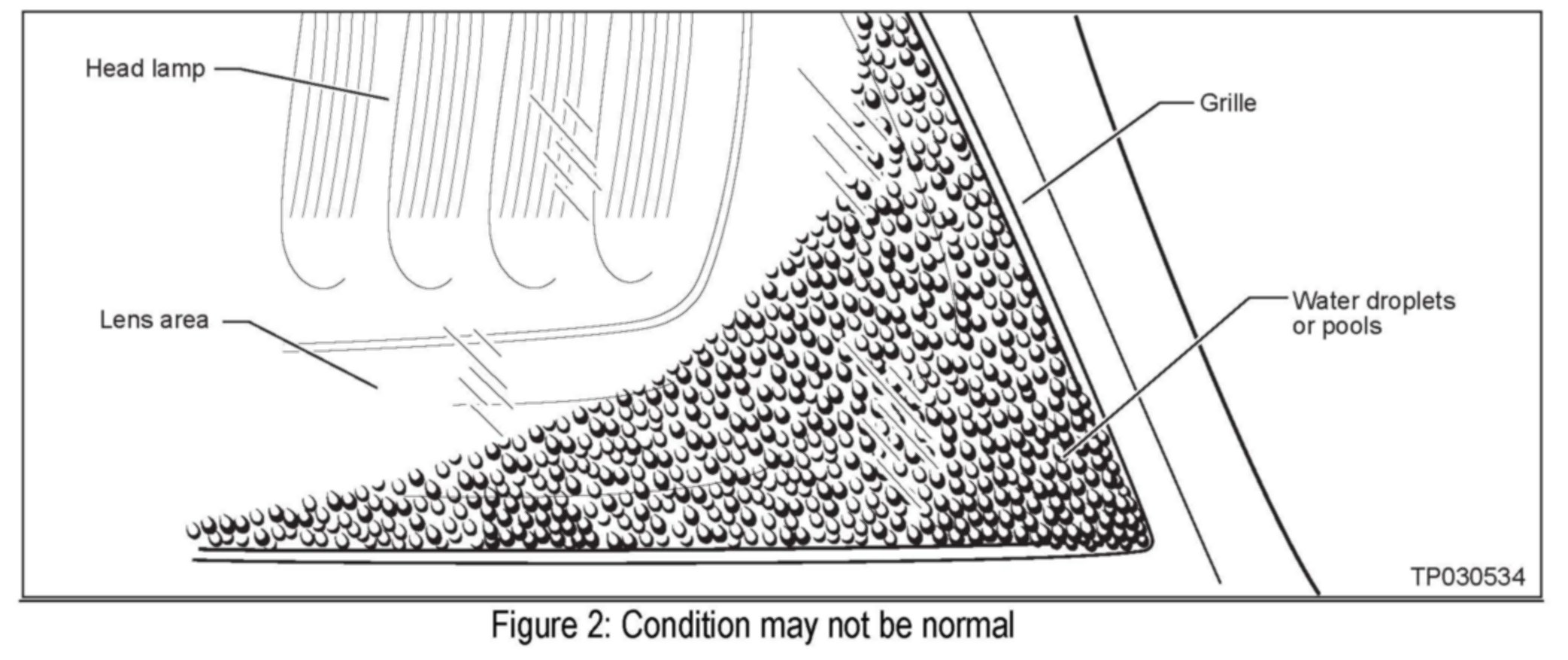 If the moisture trickles, drips, or pools it may not be considered normal and the headlamp assembly may have a water leak path. See Figure 2 for an example.
